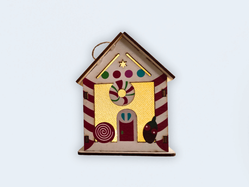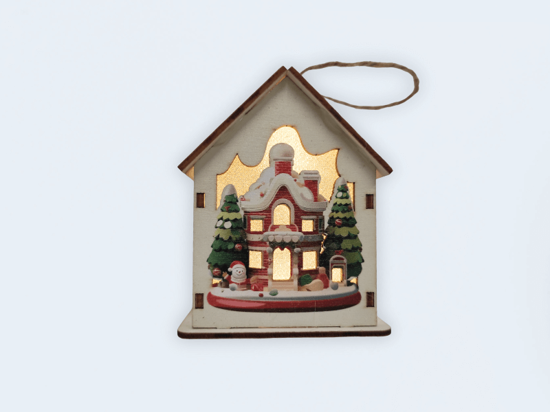 Adorno colgante en forma de casita de Navidad fabricado en madera. Ilumina tu hogar y aporta esa sensación cálida en el ambiente. Perfecta para colgar en la puerta de casa o en tu árbol y evocar un ambiente acogedor en esa estancia. Las casitas están disponibles en 4 modelos que se enviarán de forma aleatoria según disponibilidad.