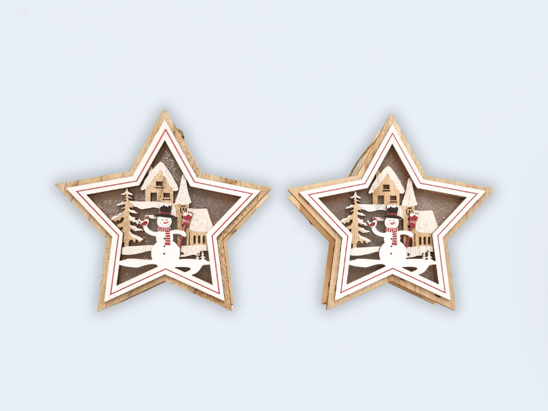 Pack de 2 adornos navideños con luz, con forma de Estrella realizada íntegramente en Madera. Decorada con un paisaje navideño tridimensional. Lleva bombillitas con luz led que funcionan con pilas y que además de dar un toque más cálido al conjunto, forman parte de su decoración.